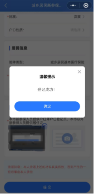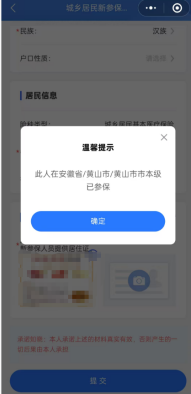 第三步 提交完成之后,如提示“登记成功”即为已完成参保登记,可继续完成缴费操作。如提示“此人在安徽省/黄山市/.....已参保”,则直接进行缴费操作;若您已参保职工,需暂停职工医保关系后才能参保居民并缴费。